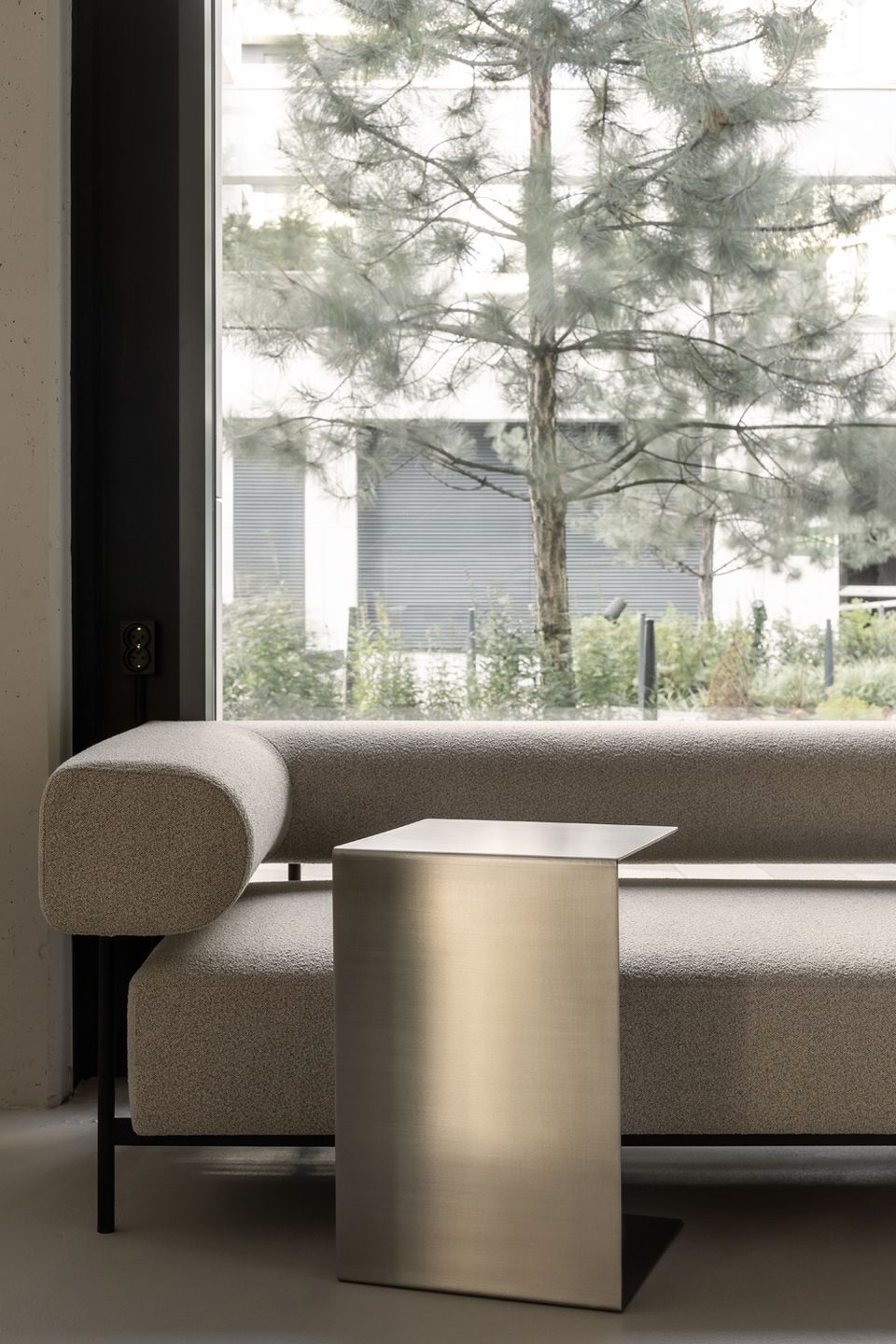 Зважаючи на орендний формат приміщення, команда свідомо відмовилася від складних оздоблювальних рішень для стін. Натомість акцент зроблено на матеріальності: тепле дерево, нержавіюча сталь і український камінь — лабрадорит — формують стриману, але тактильну палітру. Меблі здебільшого виконані на замовлення, а готові позиції представлені українськими брендами, що підкреслює сучасний локальний контекст проєкту.