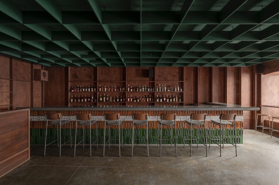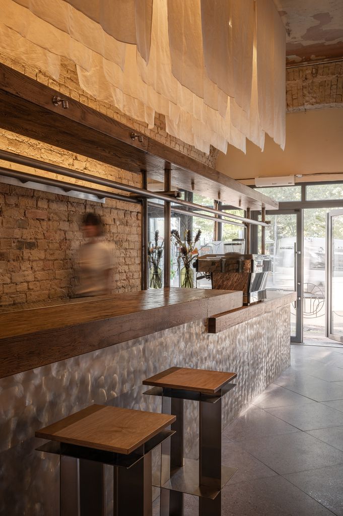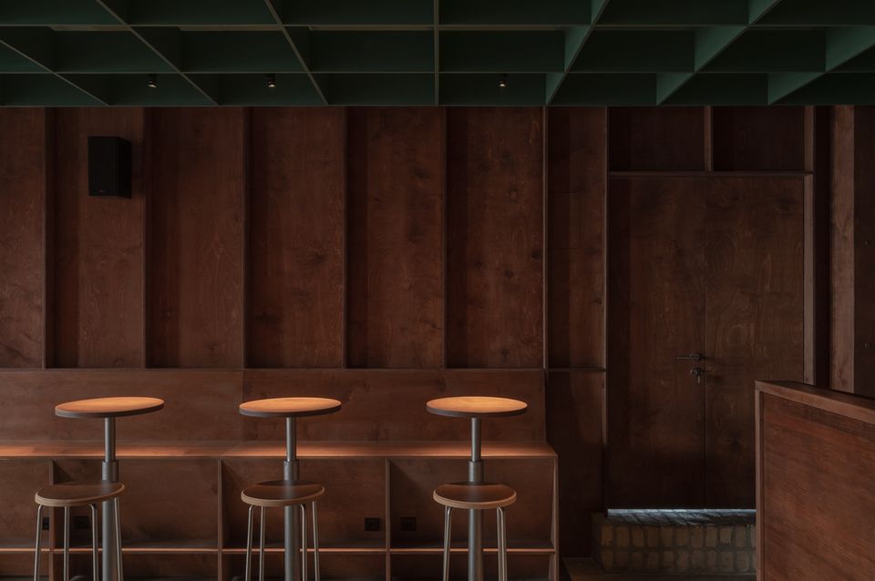 У серці Подолу, на першому поверсі готелю Bursa, Настя Мірзоян створила камерний бар, у якому сучасний японський мінімалізм поєднаний з культурою вінілу. Простір вибудувано навколо трьох елементів — звуку, світла та матеріальності. Фанера формує теплу акустику, нержавійка додає ритму, а продумане сценарне освітлення створює вечірню атмосферу. Проєкт вирізняється тонким балансом між стриманою естетикою та емоційністю музичної сцени.