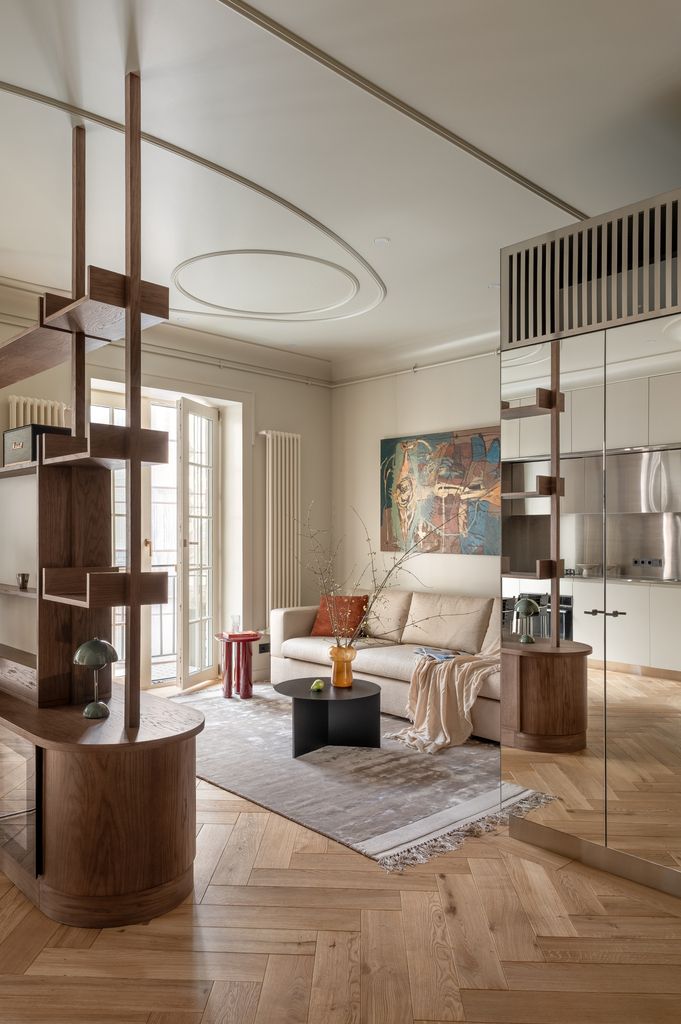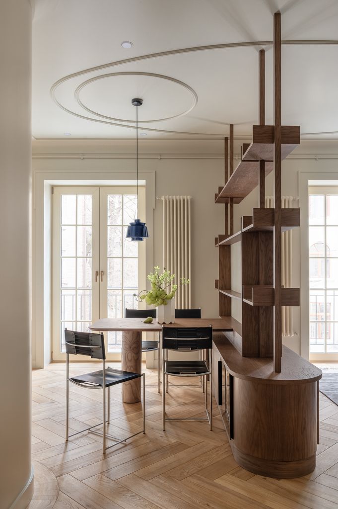 Квартира в історичному будинку стала інтерпретацією пам’яті та сучасності. Планувальне рішення об’єднало кухню та вітальню, наповнивши простір світлом і тишею. Дубові поверхні, м’які тактильні текстури та стримані металеві акценти формують інтер’єр, що природно продовжує архітектуру будівлі. Особливу роль відіграє стелаж-перегородка з дерева — водночас функціональний елемент і композиційний жест. Darvina — приклад того, як орендоване помешкання може зберігати глибину й індивідуальність.