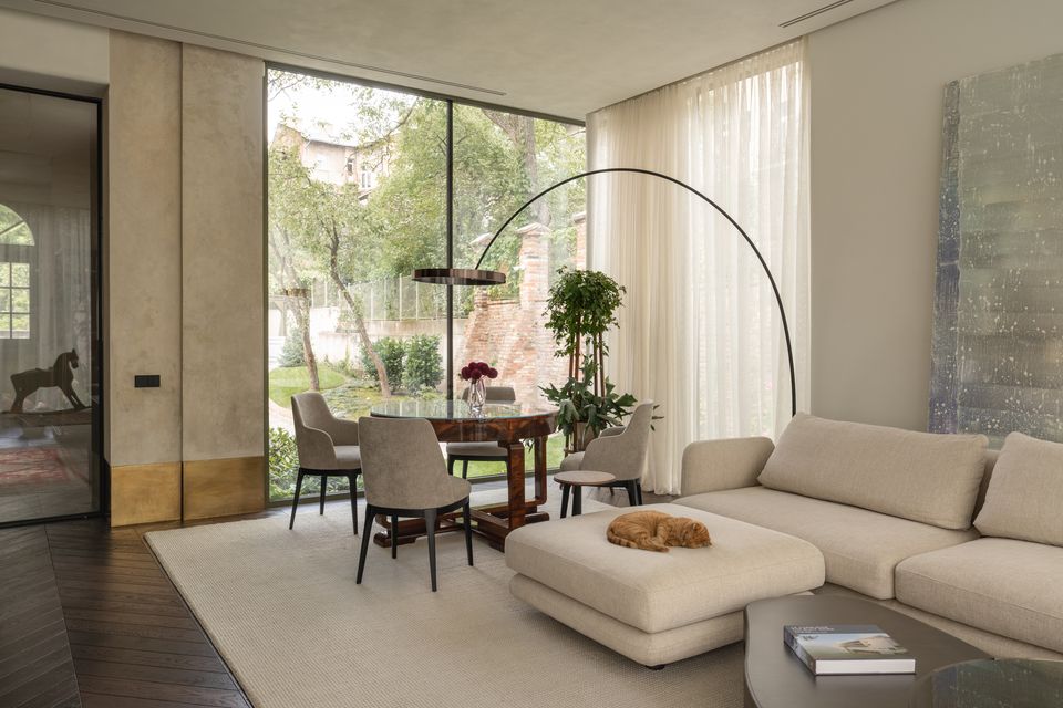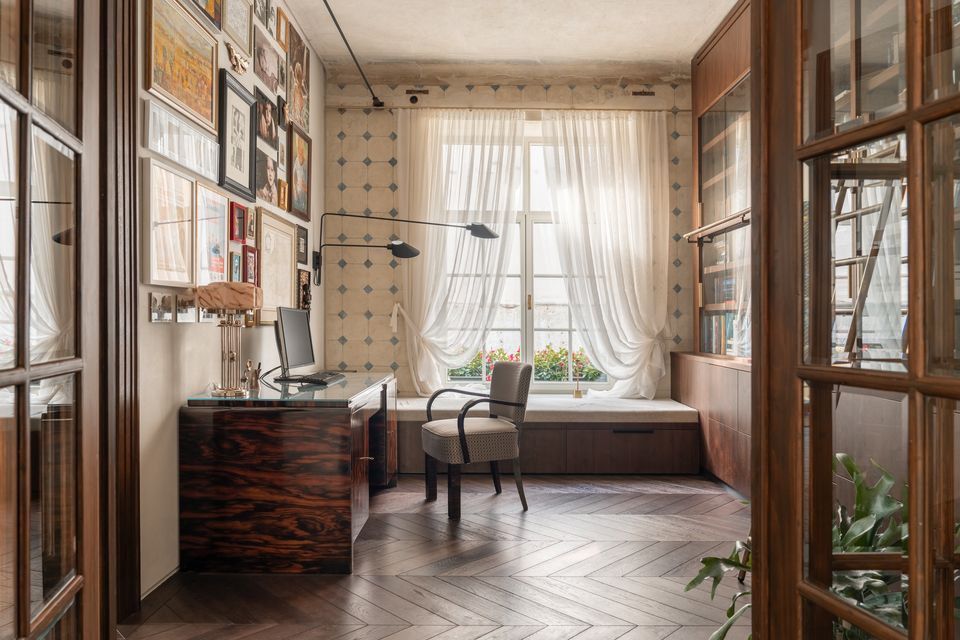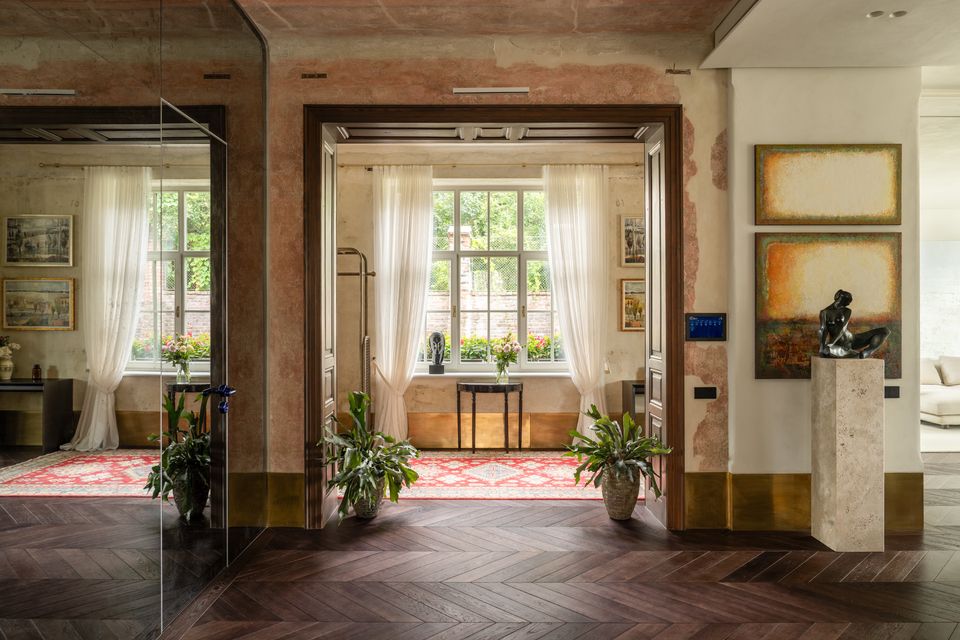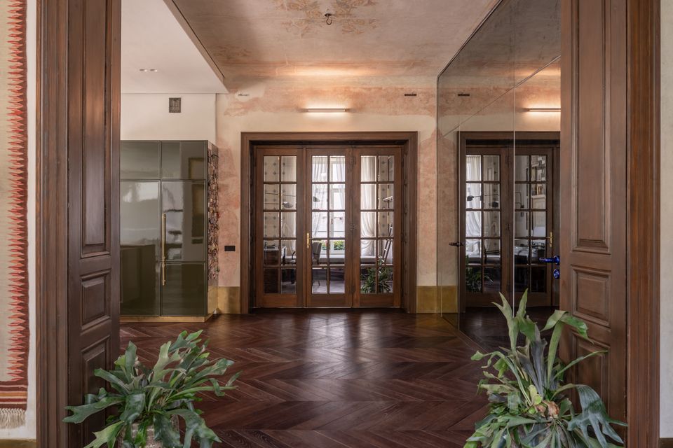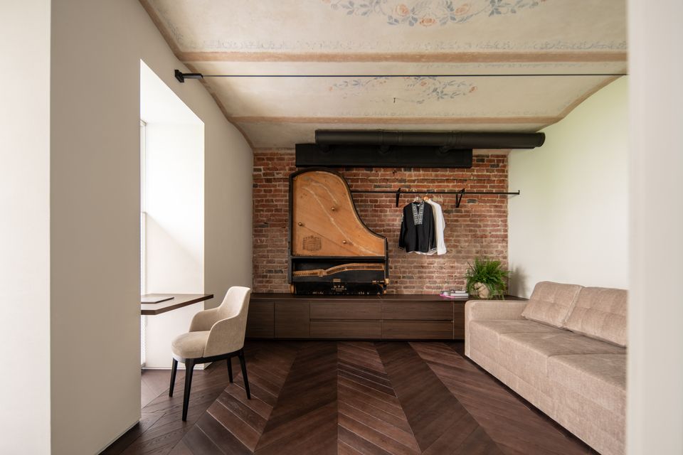 Інтер’єр працює на контрасті: з одного боку — реставровані стелі, залишки старих розписів, історичні двері; з іншого — сучасні матеріали і досить стримані рішення. Темний паркет у французьку ялинку додає глибини, латунний плінтус проходить через простір як лінія, що все зв’язує, а меблі з насиченого шпону працюють як теплі акценти.