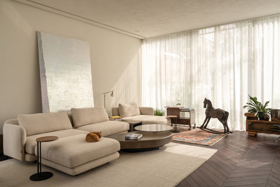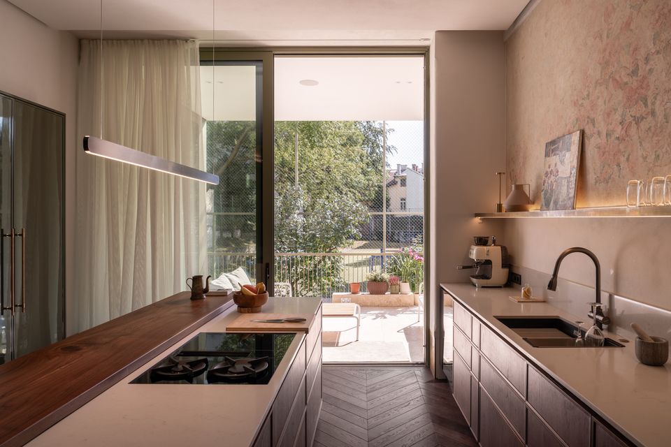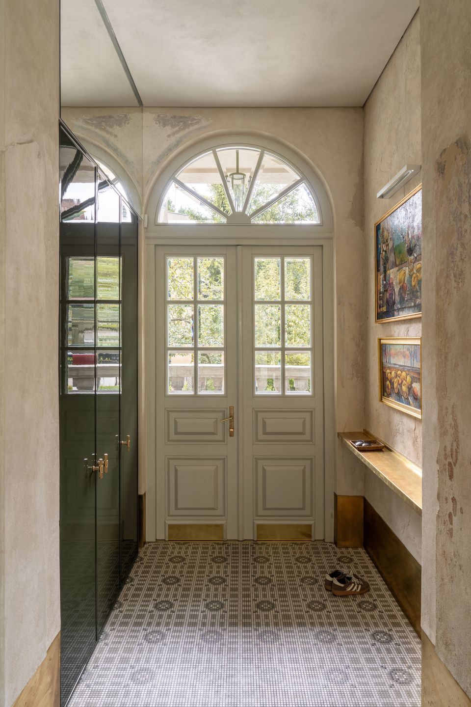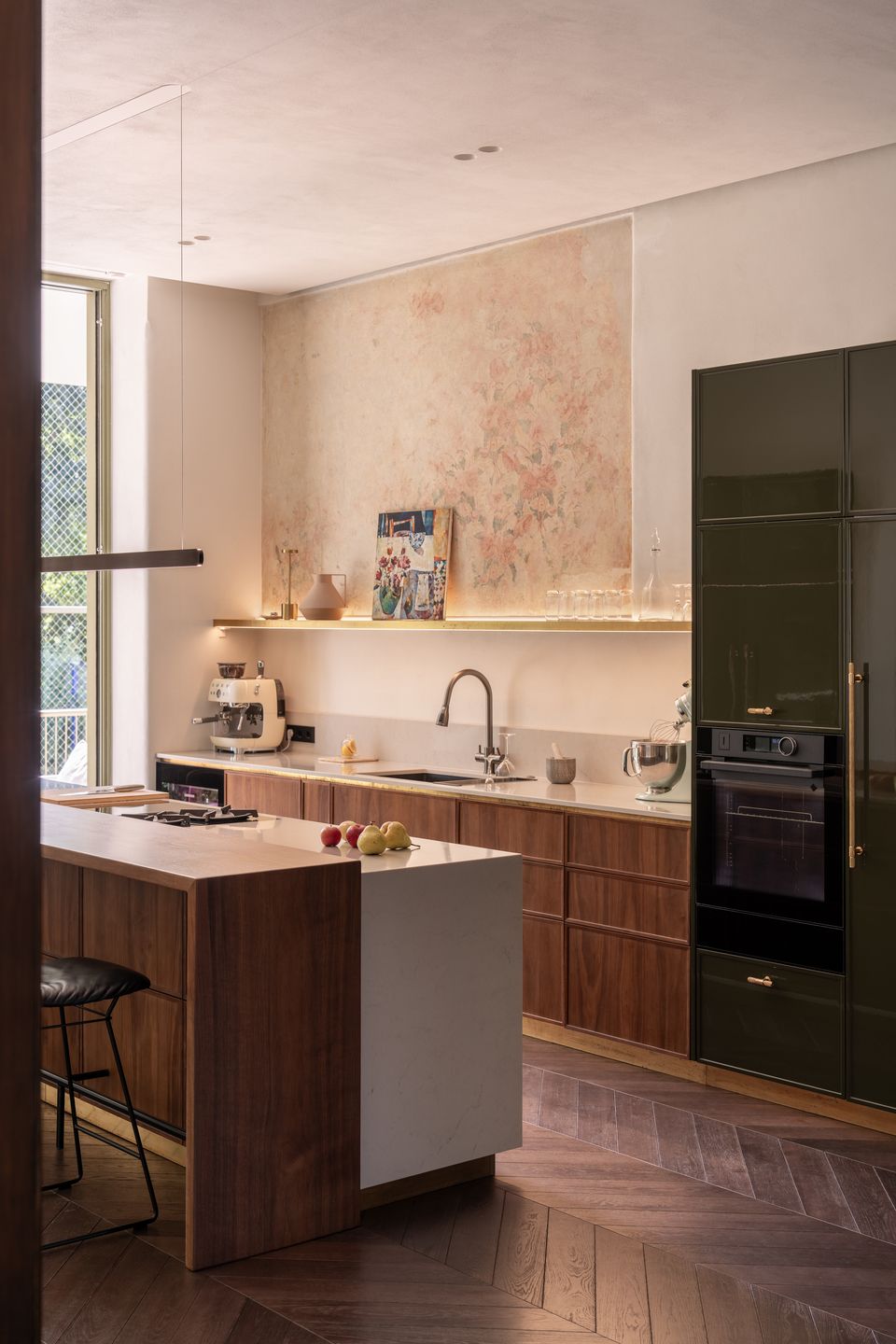 Інтер’єр працює на контрасті: з одного боку — реставровані стелі, залишки старих розписів, історичні двері; з іншого — сучасні матеріали і досить стримані рішення. Темний паркет у французьку ялинку додає глибини, латунний плінтус проходить через простір як лінія, що все зв’язує, а меблі з насиченого шпону працюють як теплі акценти.