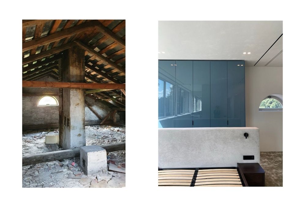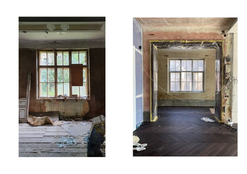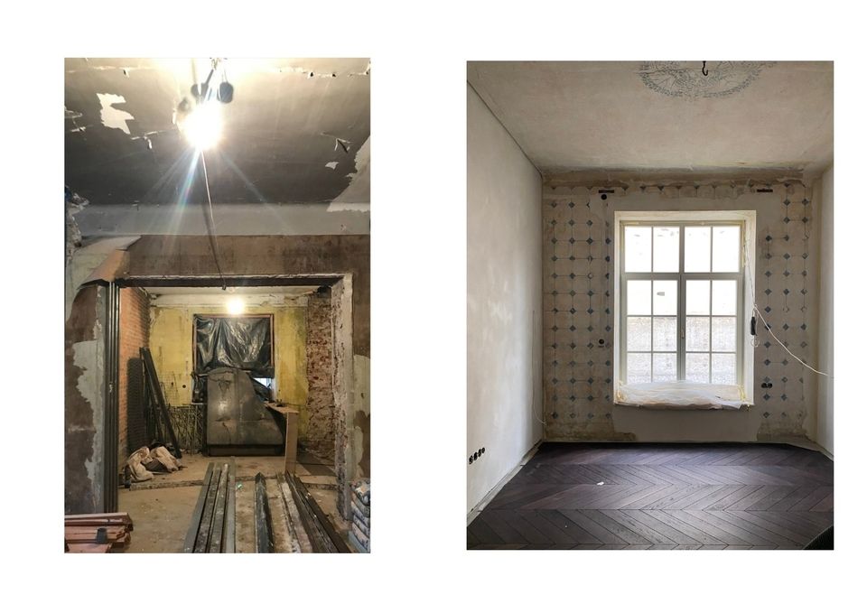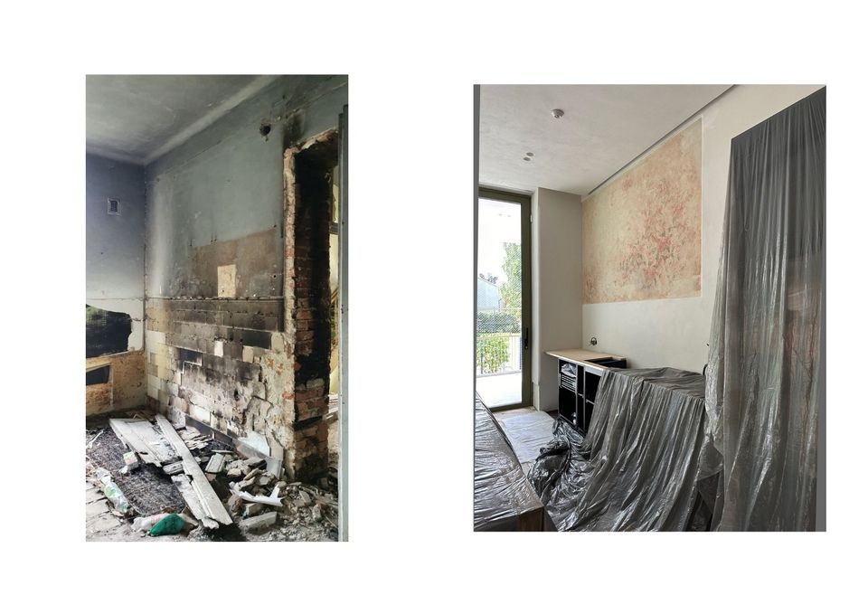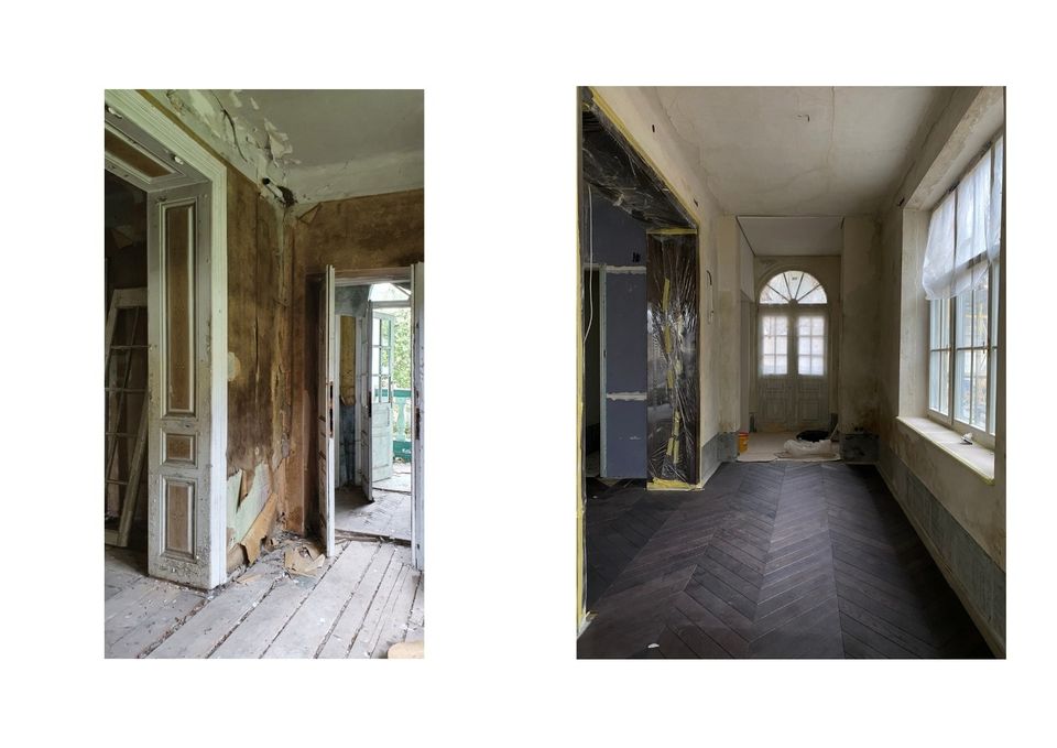 Коли архітектори вперше зайшли всередину, будинок був у складному стані: пошкоджена покрівля, волога, грибок, частково знищені оздоблення. Але разом із цим — чітка структура, історичні деталі і той самий потенціал, заради якого такі будівлі не зносять, а намагаються врятувати.
