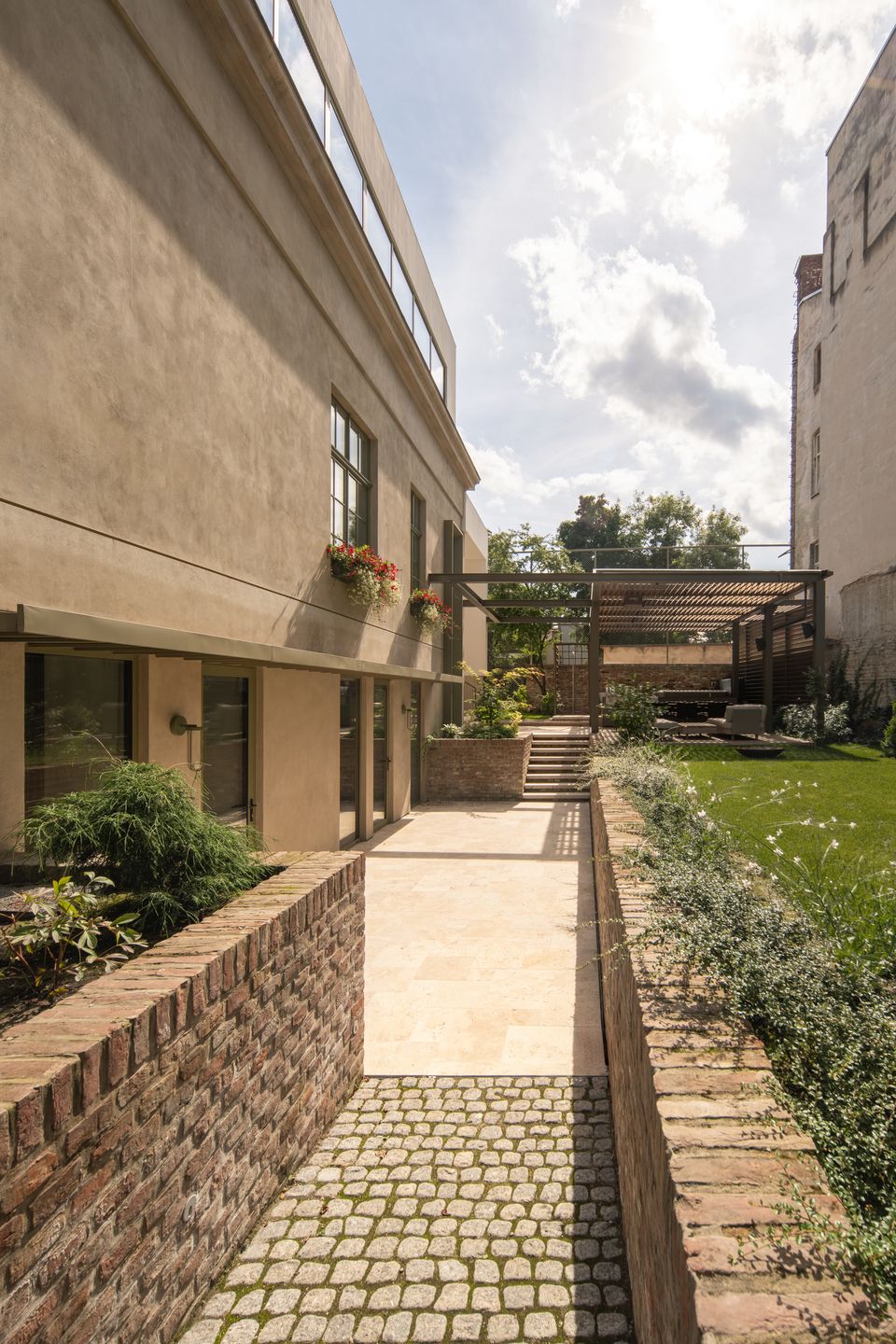 Архітектурне рішення не намагається «відновити як було» або стилізувати під минуле. Замість цього — доволі чесний підхід: зберегти те, що має цінність, і додати нові об’єми так, щоб вони не конкурували, а підсилювали стару структуру. Саме тому нові частини виглядають стримано і майже фоново — прості геометрії, пласка покрівля, мінімум жестів.