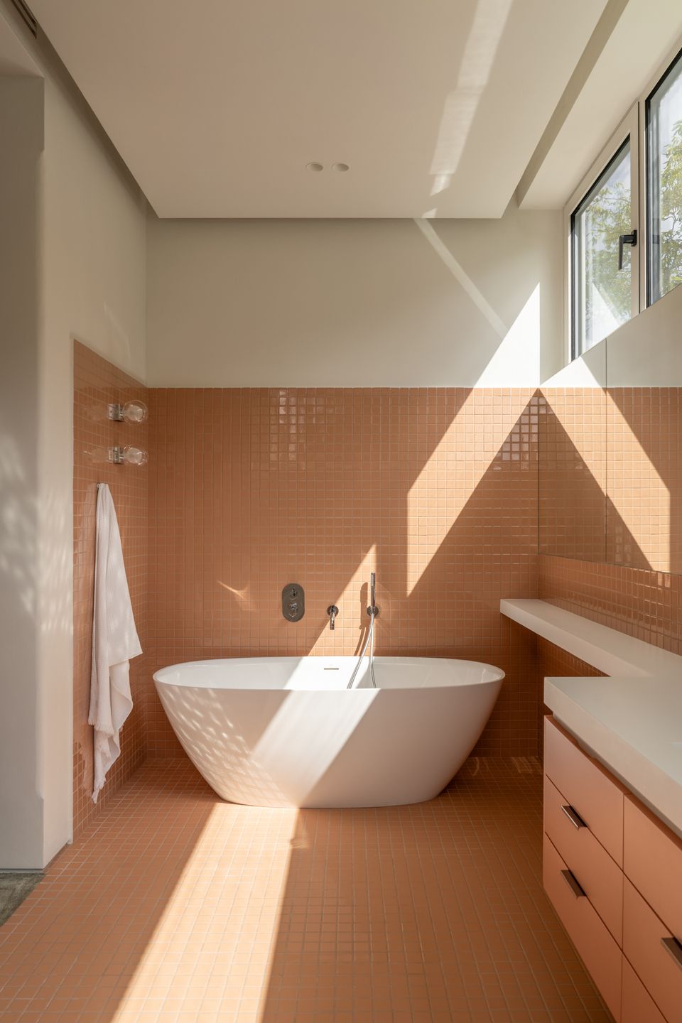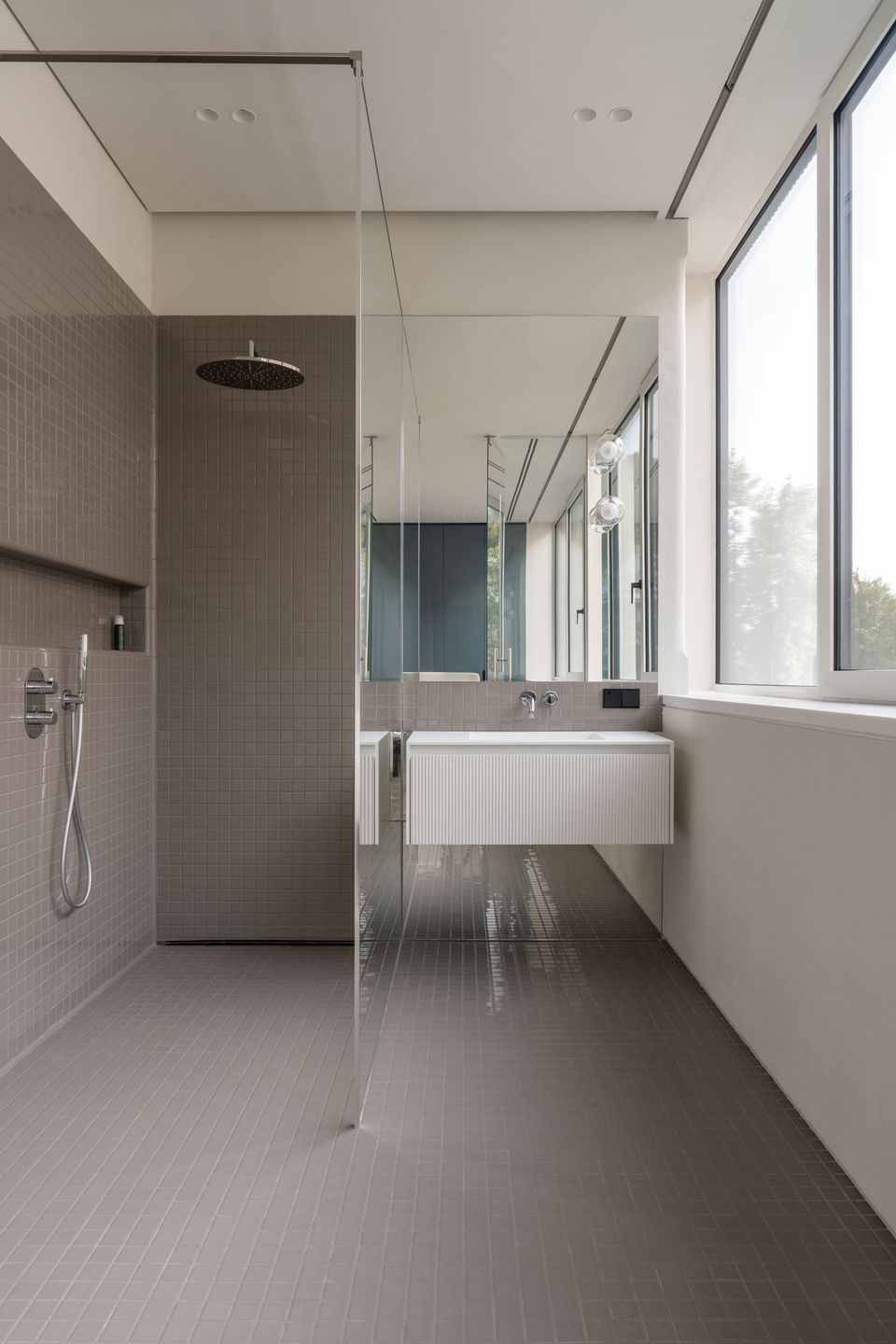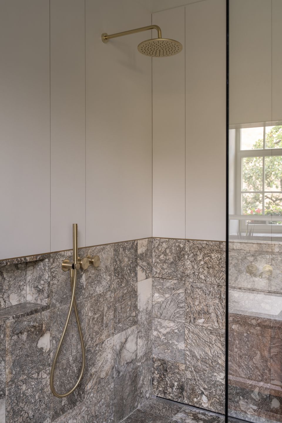 Цікаво, що навіть у санвузлах команда не пішла шляхом «все в плитку». Тут використали історичну логіку модерну — плитка лише до певного рівня, решта стін — штукатурка. Це дрібниця, але саме такі рішення формують відчуття цілісності.