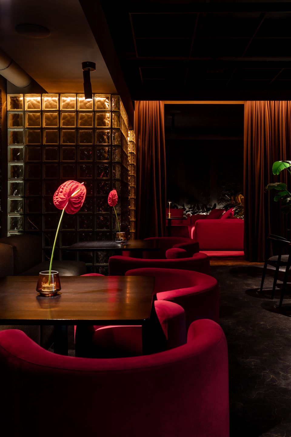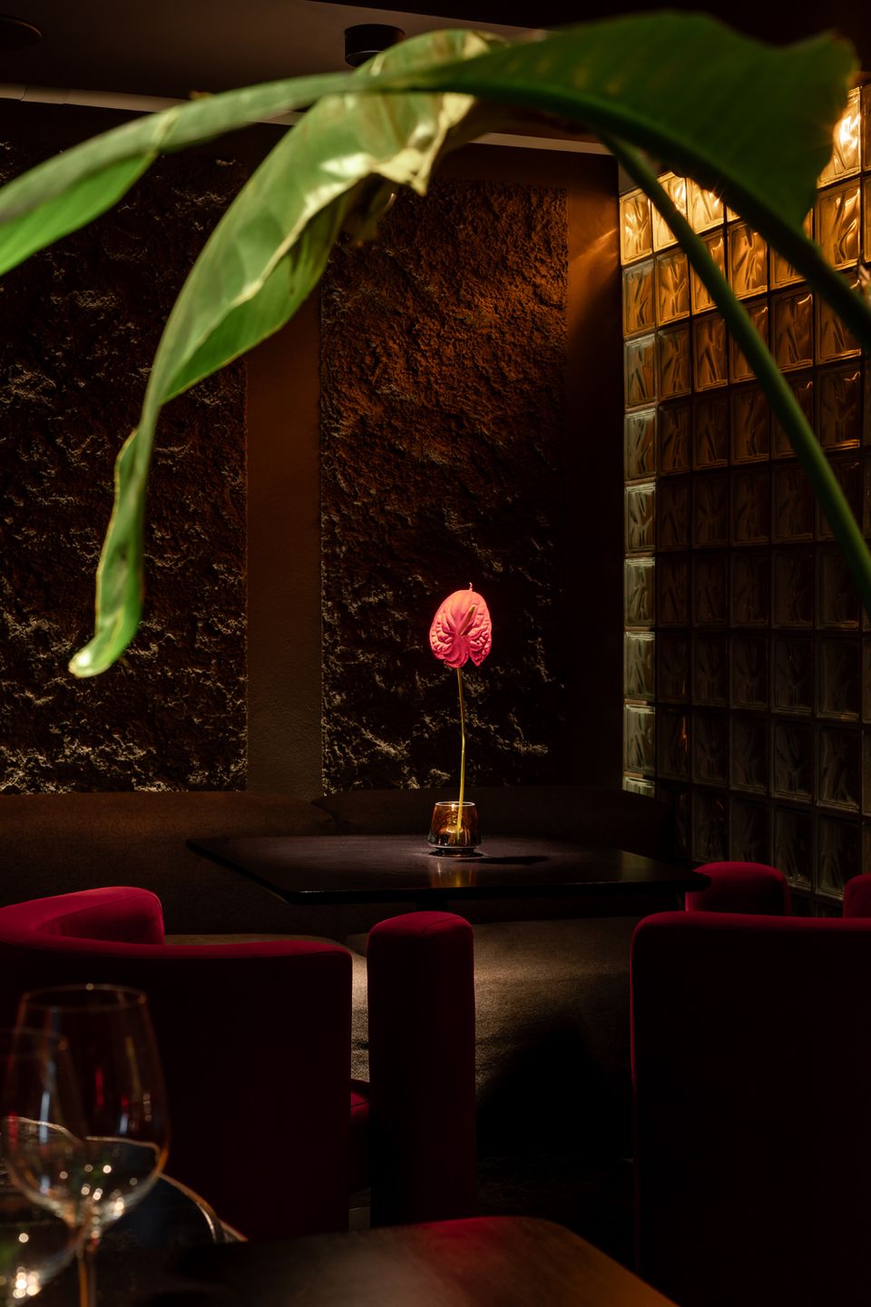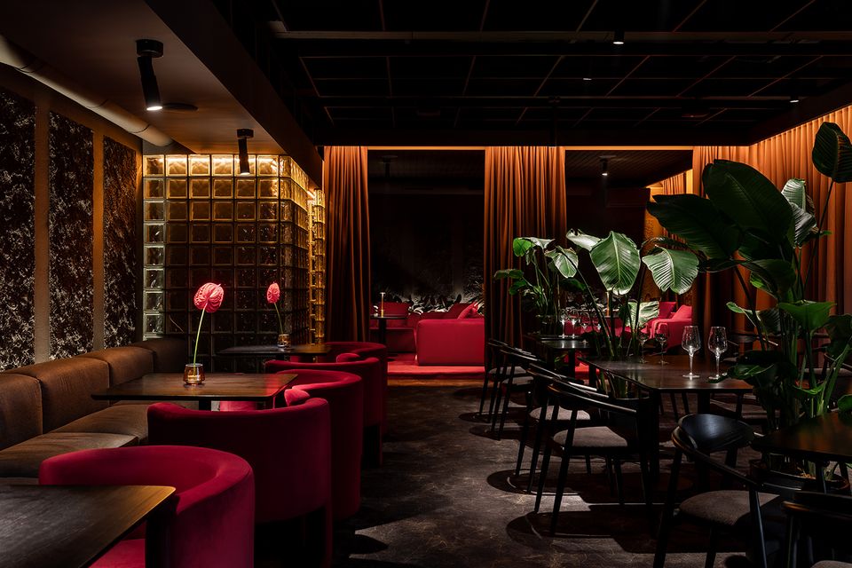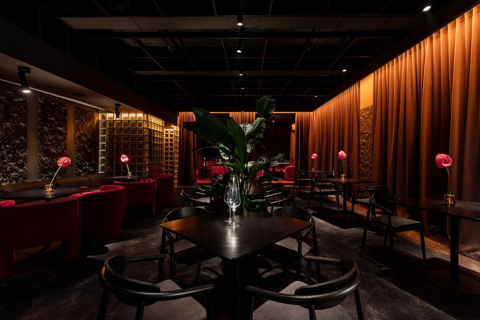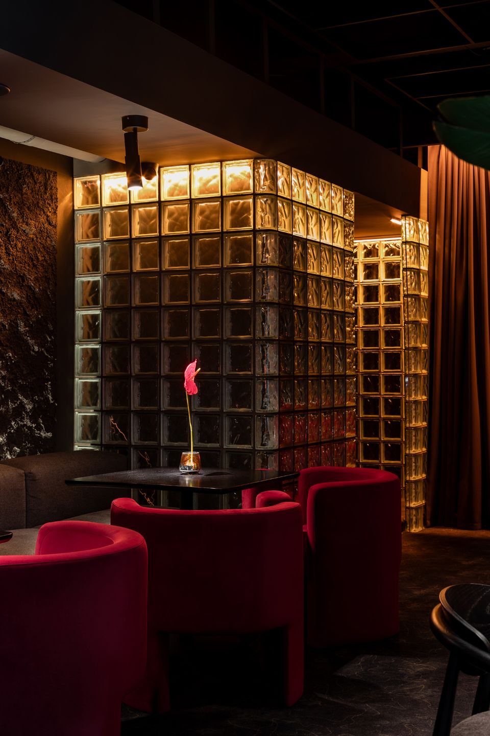 Перед командою архітекторів стояло завдання не просто збільшити площу, а змінити поведінку та ритм гостей. Новий простір працює інакше: повільніше, приватніше, з акцентом на якість досвіду. Темна, насичена бордова палітра, рельєфні стіни, підсвічені склоблоки та щільні текстильні штори формують ніші, де кожен відвідувач ніби опиняється у власному мікропросторі.