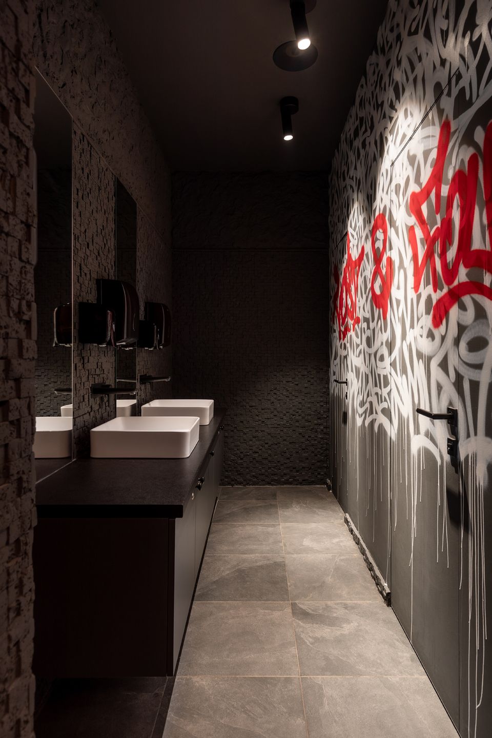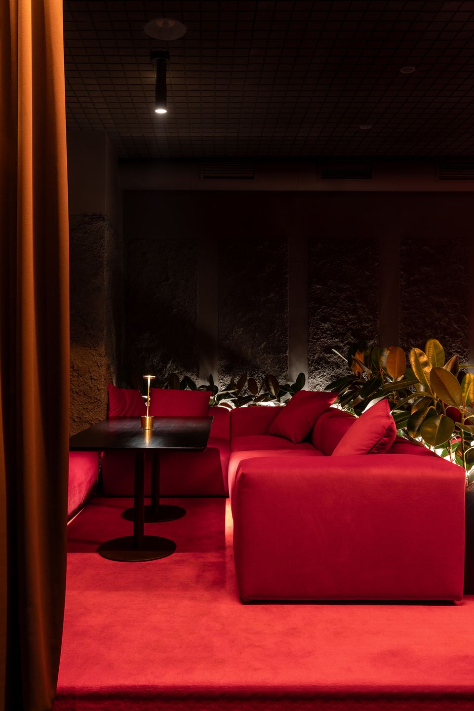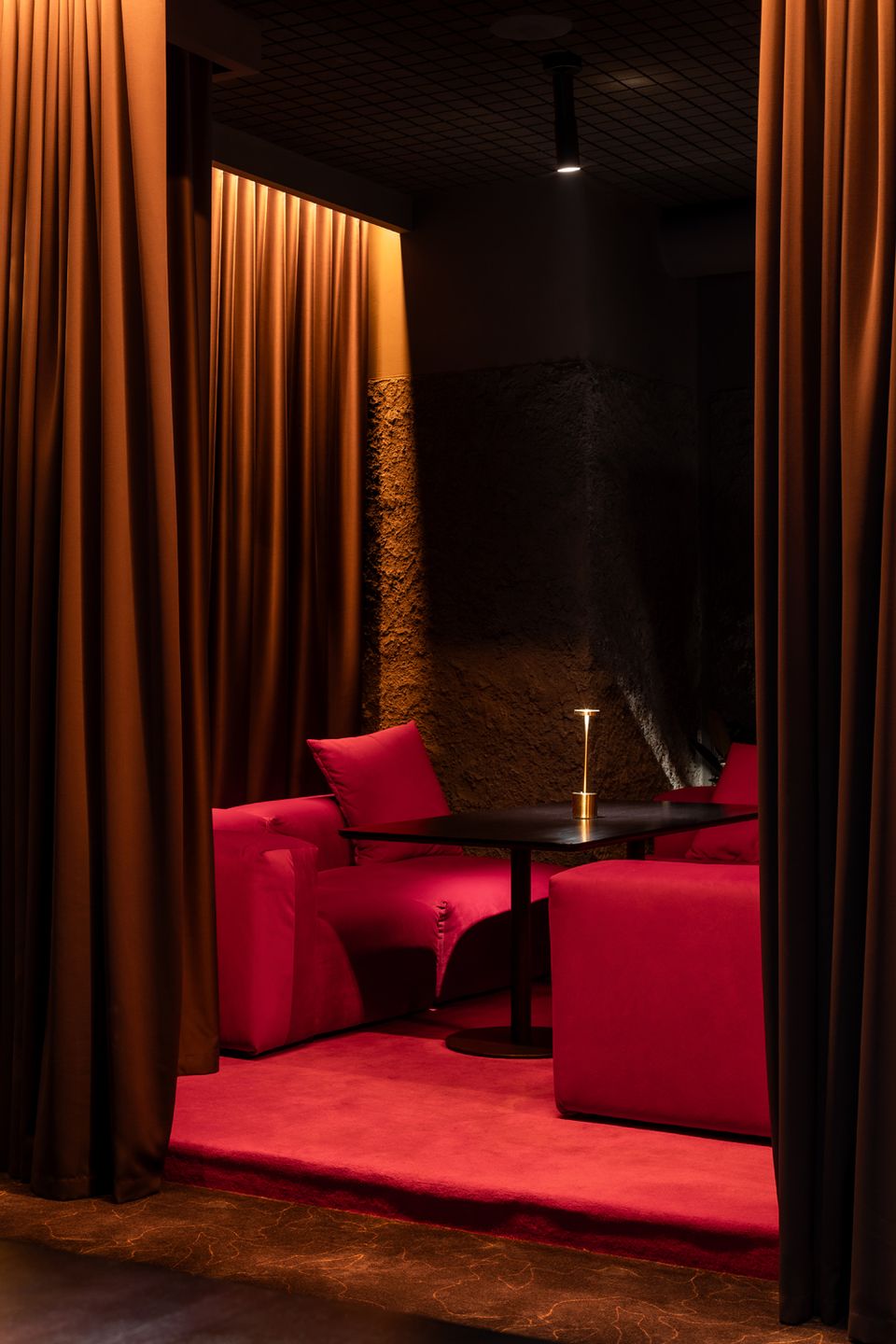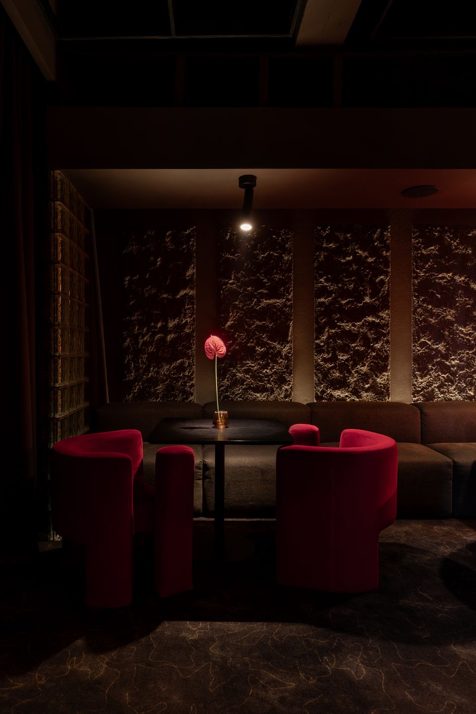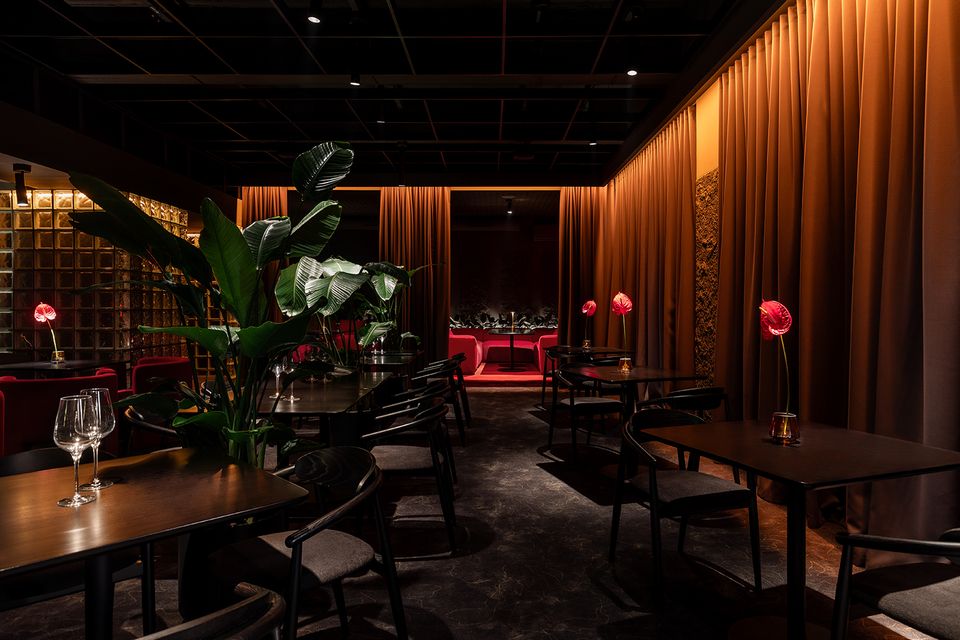 Перед командою архітекторів стояло завдання не просто збільшити площу, а змінити поведінку та ритм гостей. Новий простір працює інакше: повільніше, приватніше, з акцентом на якість досвіду. Темна, насичена бордова палітра, рельєфні стіни, підсвічені склоблоки та щільні текстильні штори формують ніші, де кожен відвідувач ніби опиняється у власному мікропросторі.