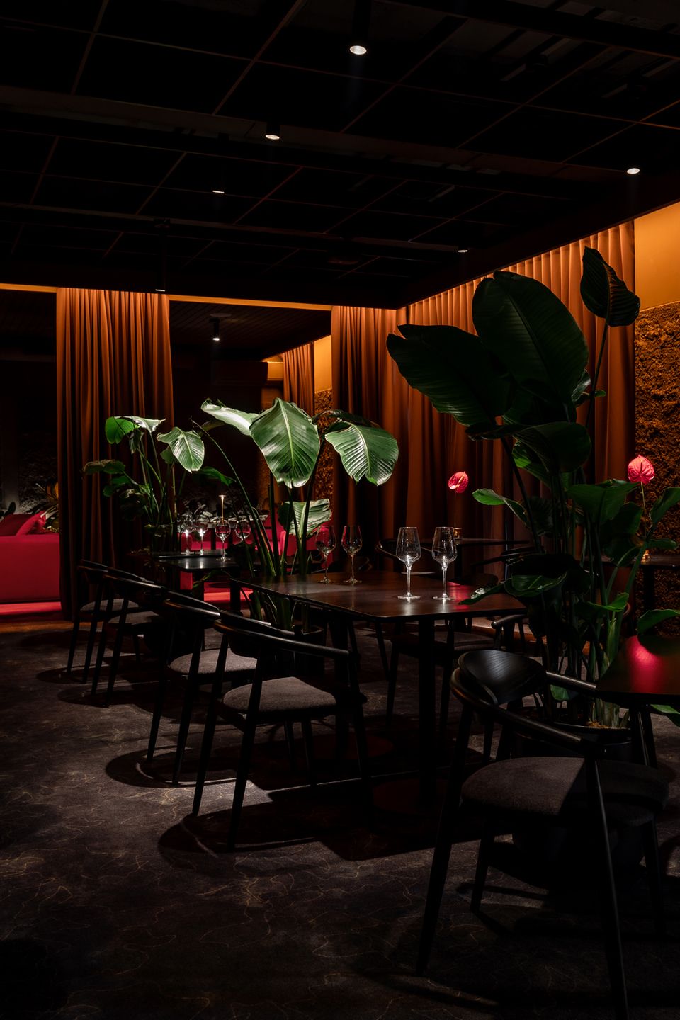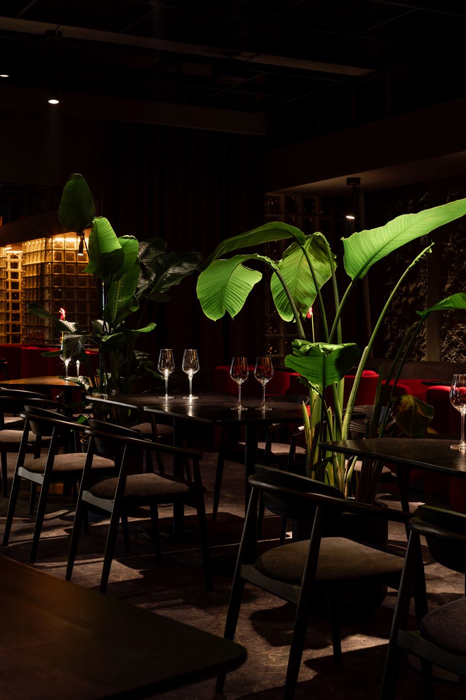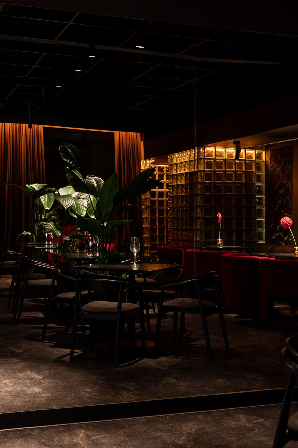 Жива зелень між столиками не лише пом’якшує темні відтінки, а й працює як зонування, розділяючи простір і додаючи відчуття приватності. Результат — атмосфера тихої, ненав’язливої розкоші, яку відчуваєш уже з перших секунд перебування.