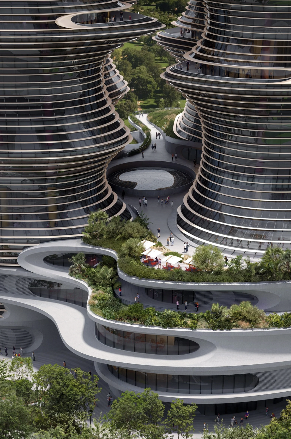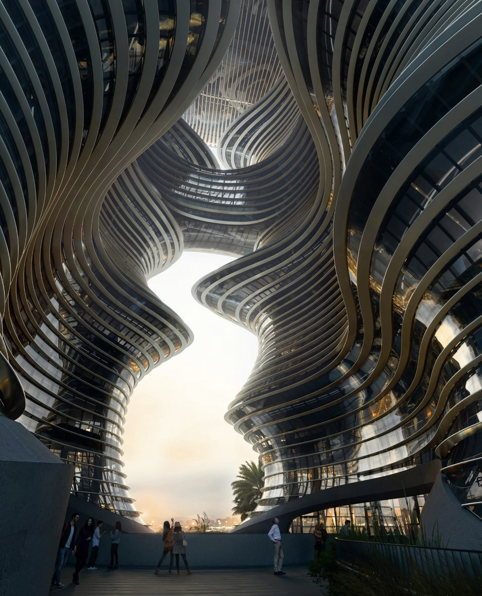 У цьому проекті архітектори трансформують природні рельєфи у вертикальний міський ландшафт, де простір та світло рухаються між вежами так само, як колись між гірськими ущелинами.