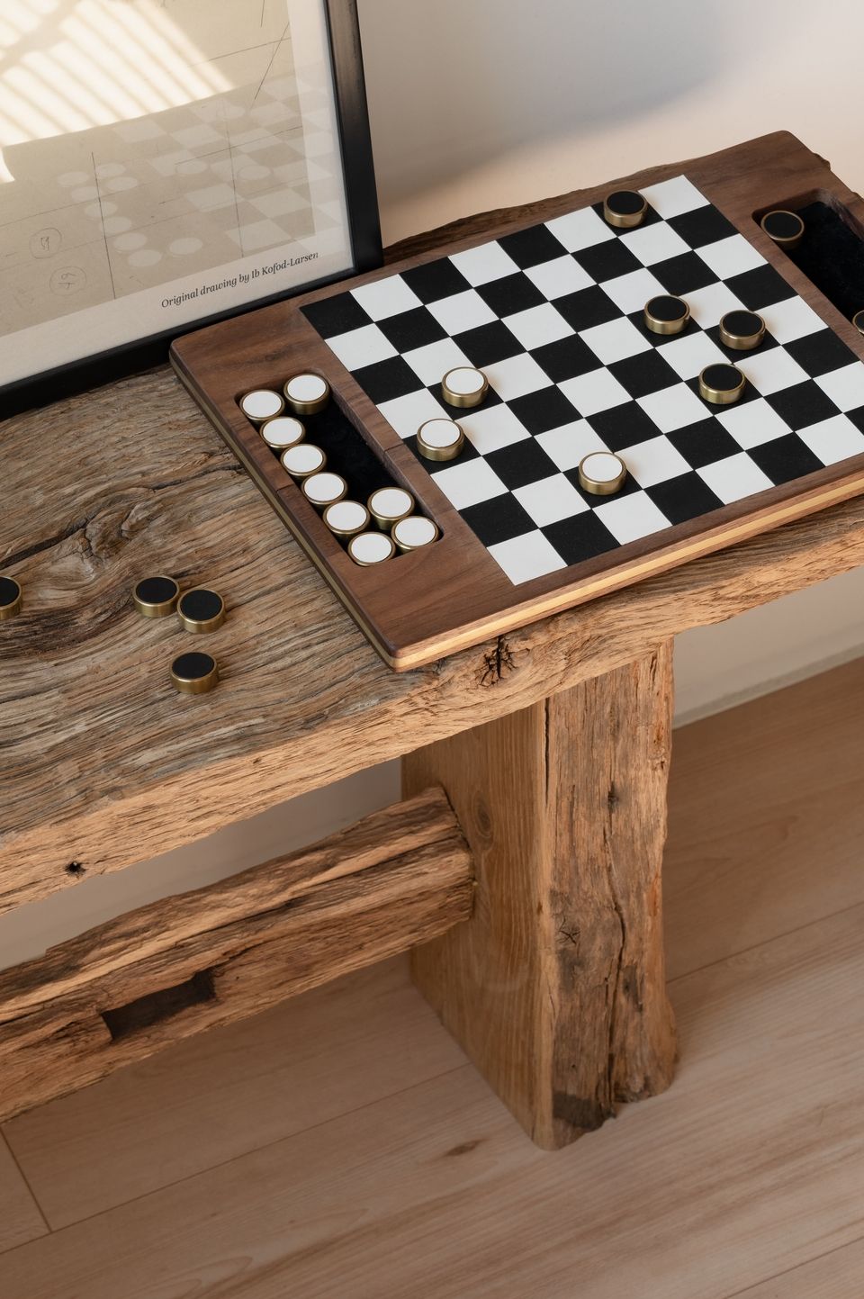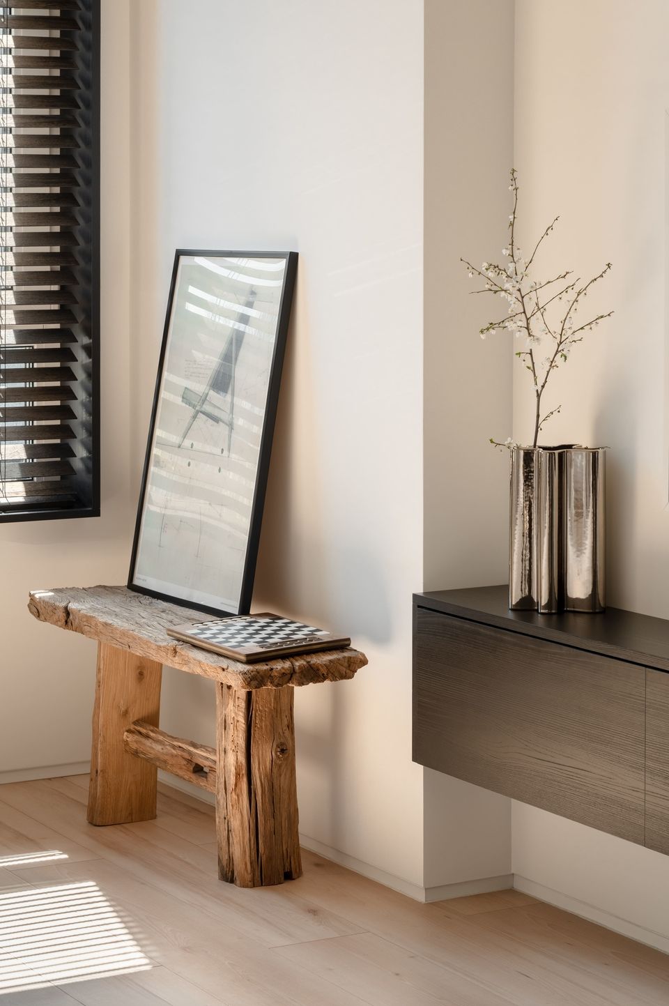 Інший дерев’яний об’єкт — приземкувата лавка, придбана у майстра із заходу України, який працює зі старим деревом. Це речі з характером і минулим, що додають глибини простору.
