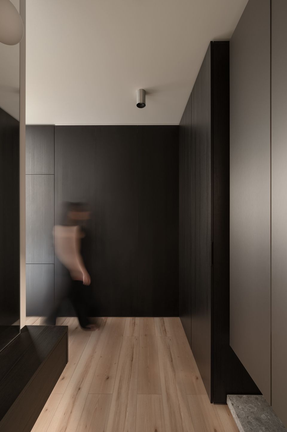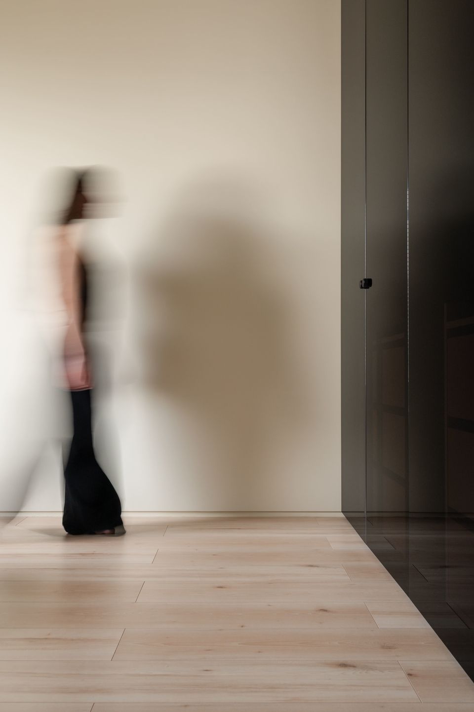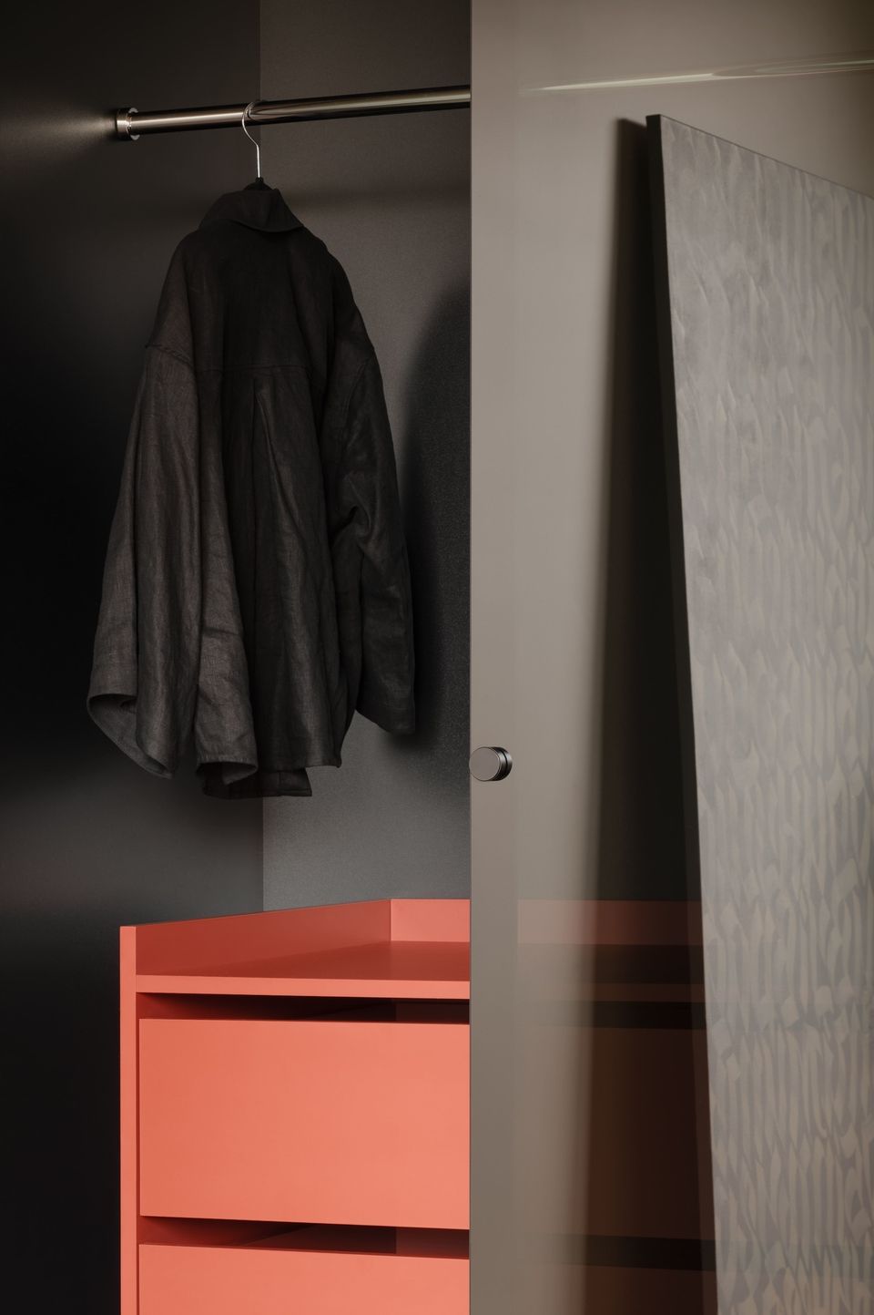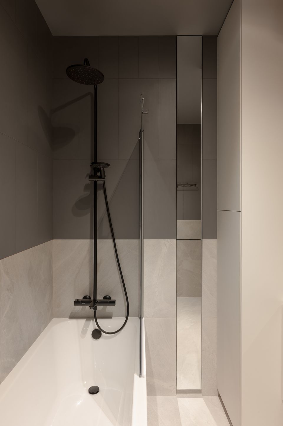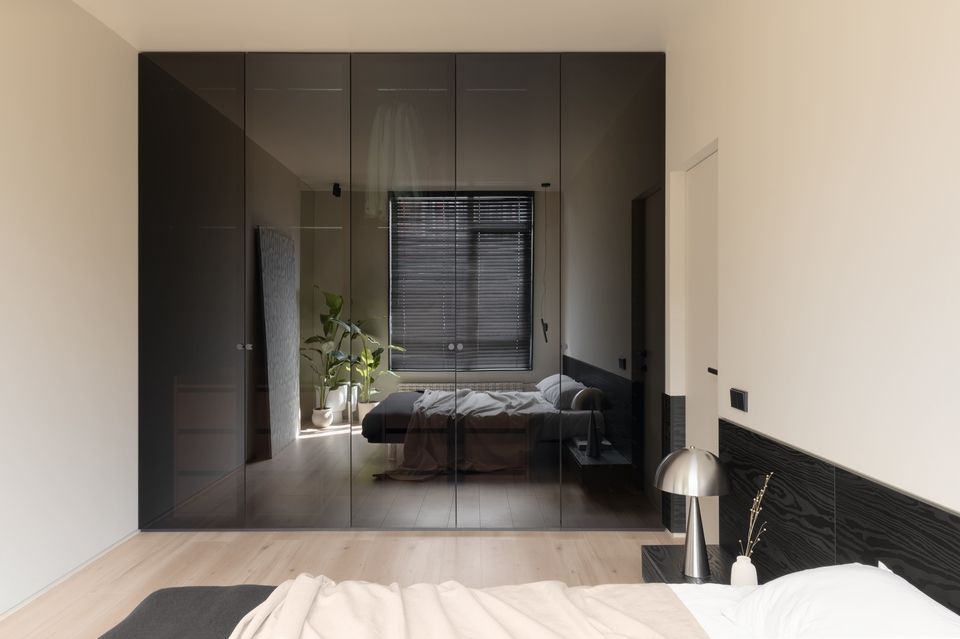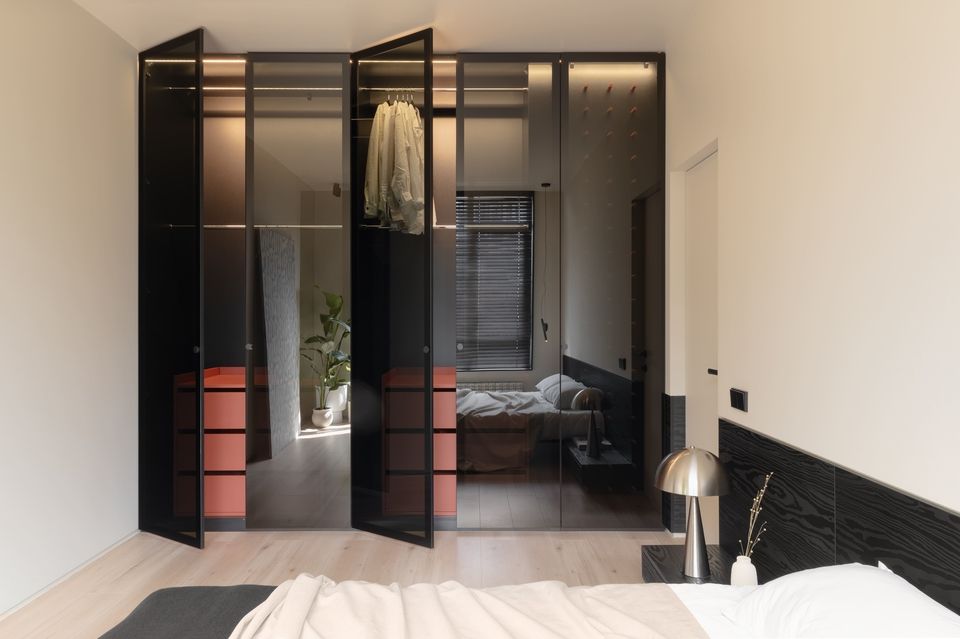 Дверний отвір, що звільнився, використали для розміщення вбудованого холодильника — він втоплений у стіну та прихований за фасадом великої шафи у спальні. Так простір залишився лаконічним, без зайвих меблів і шуму.