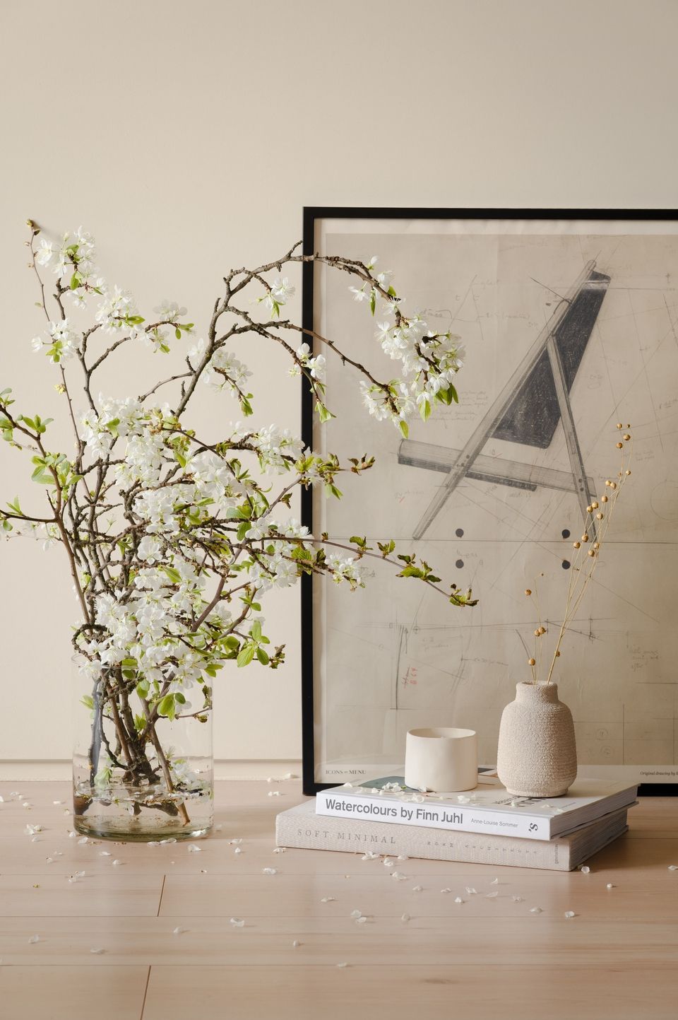 Основні матеріали — дерево, бетон, лляний текстиль і скло. Колірна гама побудована на земляних тонах, пісочних і сірих відтінках, доповнених теплим білим.