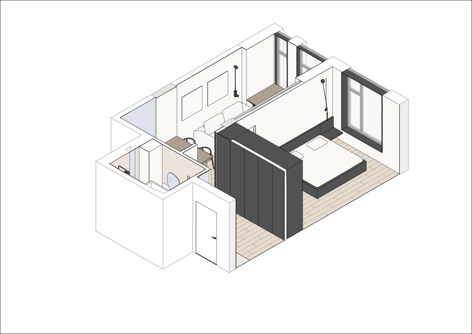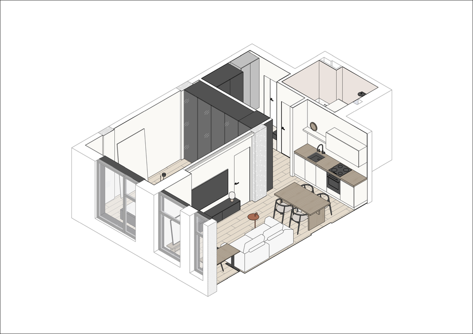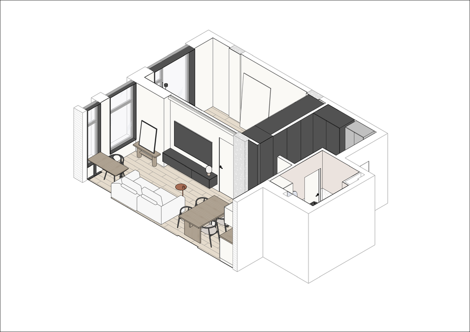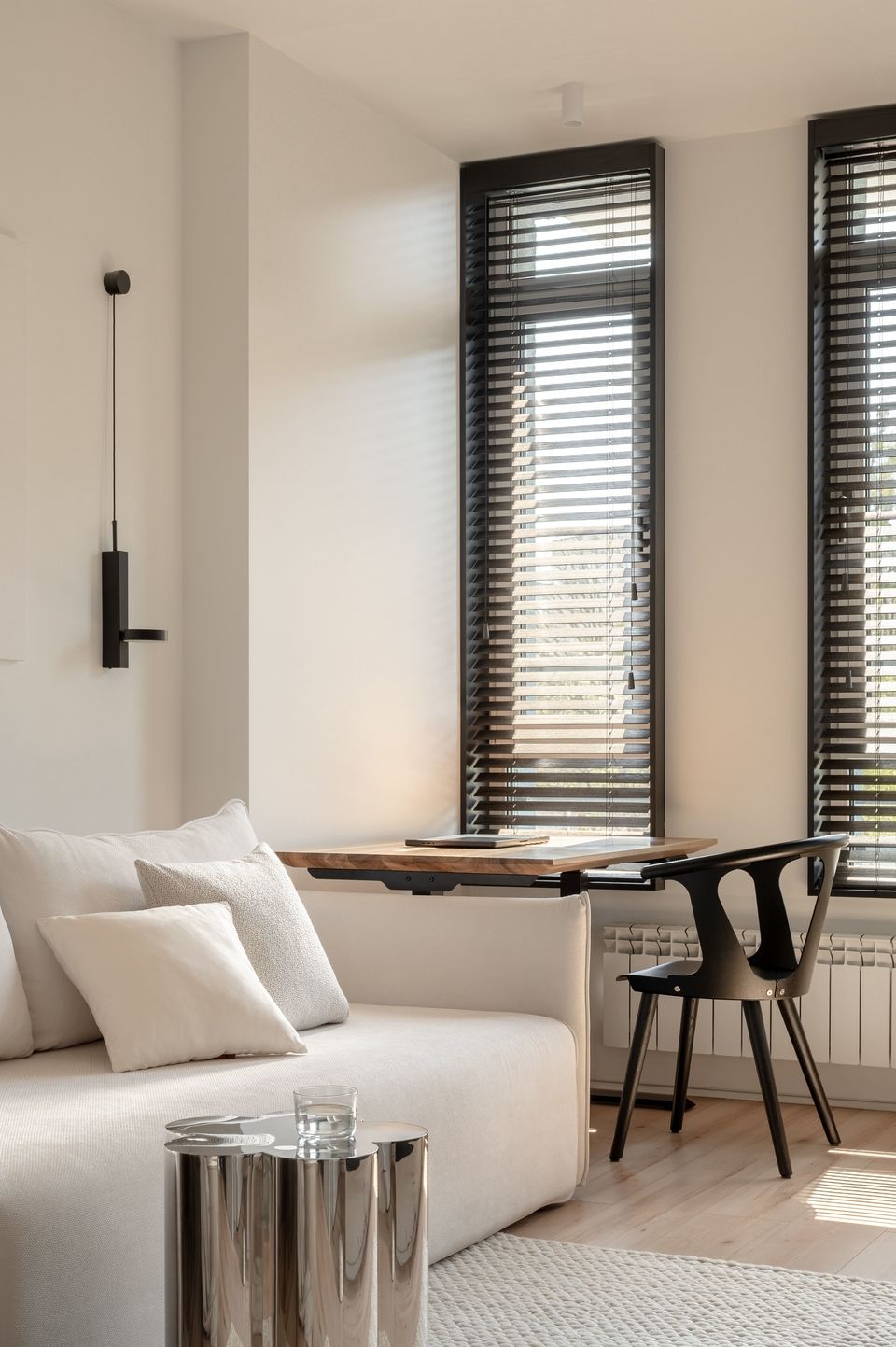 Працюючи над власним житлом, дизайнерка змінила базове планування (площа квартири становить 45 кв.м): приєднала лоджію до вітальні, створивши там робочу зону, звідки відкривається панорама на місто. Друге рішення торкнулося спальні: замість входу з коридору тепер потрапити до неї можна з вітальні, об’єднаної з кухнею.
