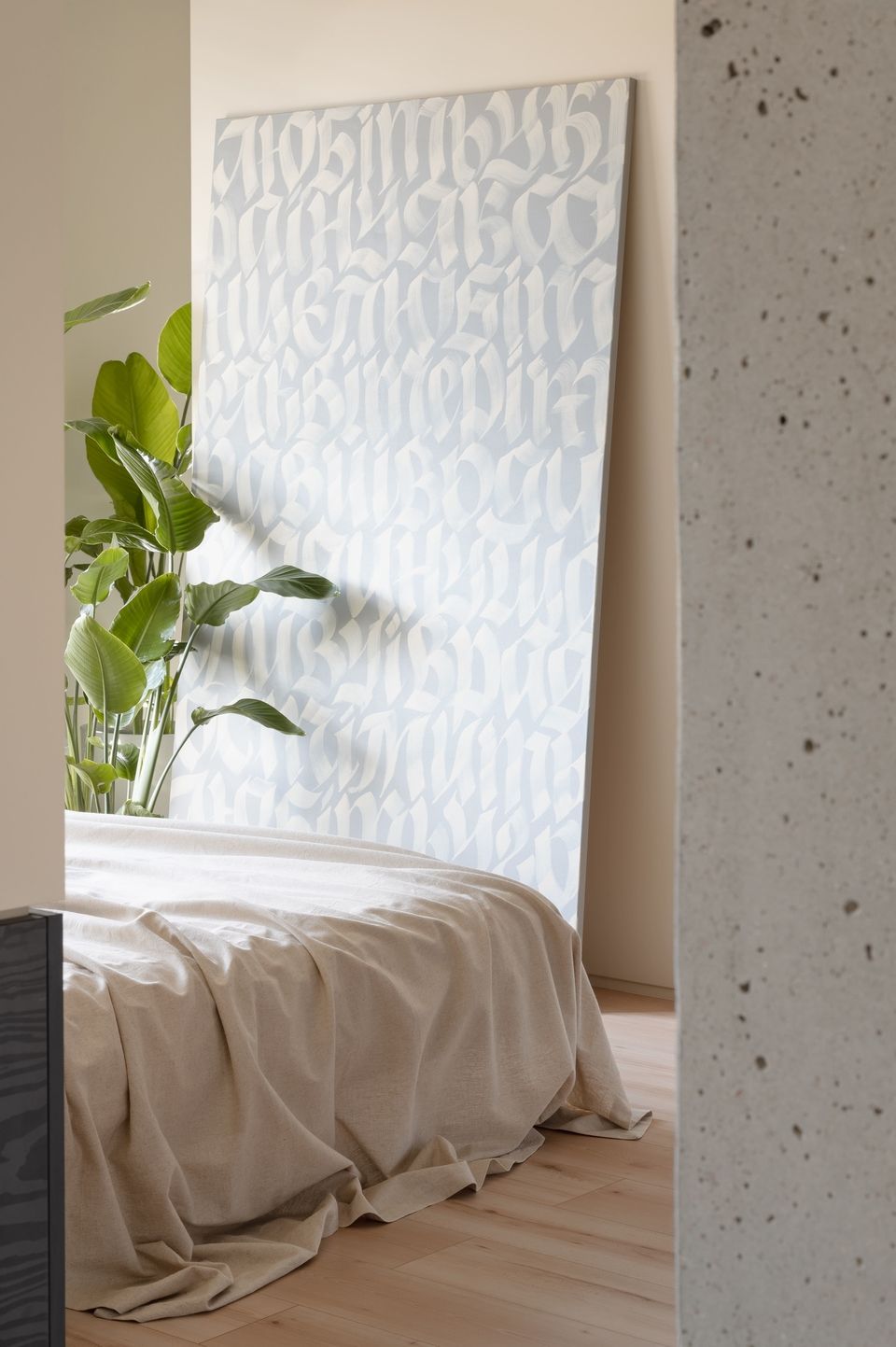 Емоційними центрами інтер’єру стали твори мистецтва. На перший погляд — це мінімалістичні полотна в стриманій кольоровій гамі, проте якщо придивитися, на них оживають рядки каліграфічного письма.