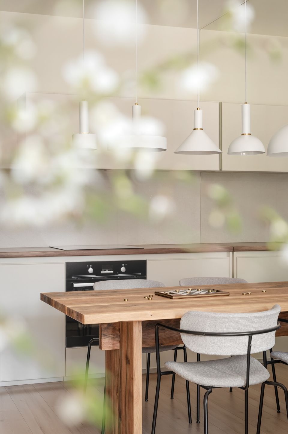 Особливою деталлю став кухонний стіл, створений із горіха, який багато років ріс у родинному дворі Наталії в Умані. Коли дерево постаріло, батько зрізав його і зробив дошки, які згодом стали частиною нового життя — меблем у квартирі доньки. У цьому предметі закладена родинна історія та відчуття тяглості, яке пронизує весь простір.